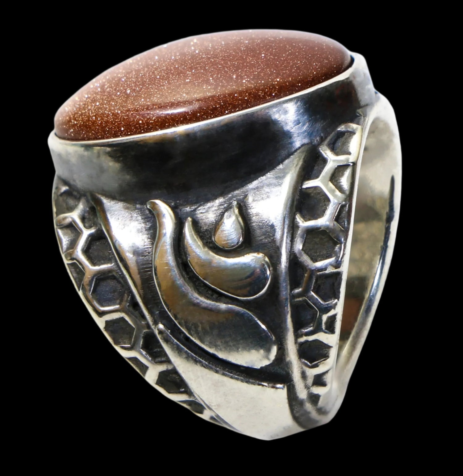 The shank features an intricate flame motif, flanked by honeycomb design.